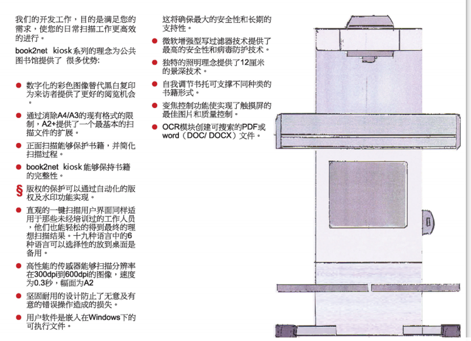 *7、提供12個月保修,維護簡便,無需校驗,拆箱即用。保證在掃描過程不對書刊的裝訂造成損壞,要求標配輕薄型高精度樹脂玻璃稿臺。